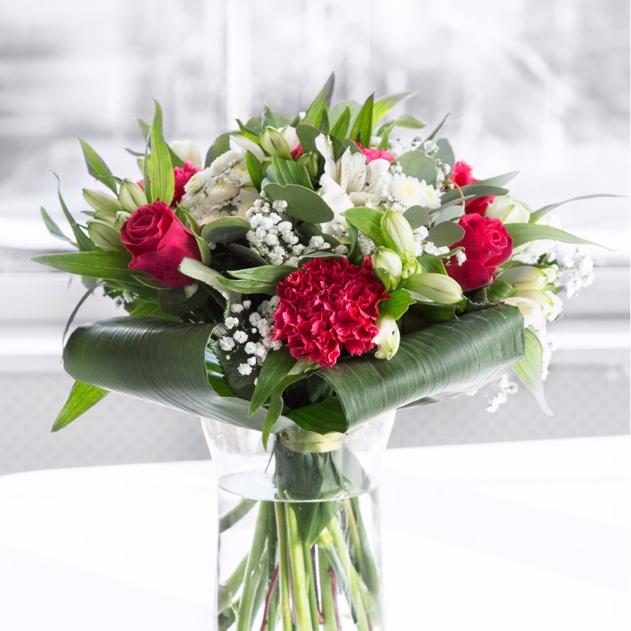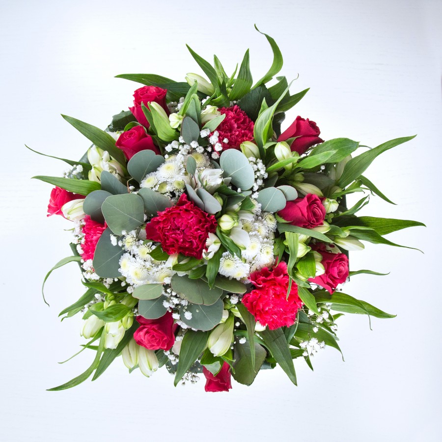 Bring radiance to any occasion with our radiant bouquet, featuring white chrysanthemums, airy gypsophila, passionate red roses, and delightful carnations, all harmoniously combined with white alstroemeria and graceful aspidistra leaves.